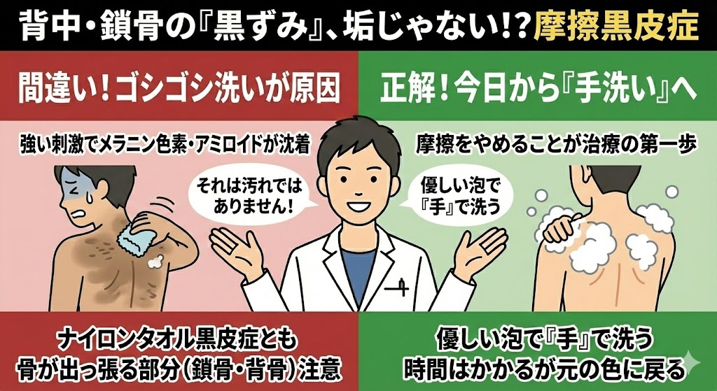 背中や鎖骨の黒ずみ。「摩擦黒皮症」について