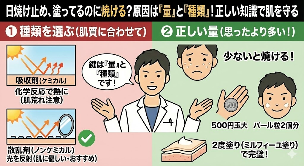 こんにちは。副院長の小野弘登です。「日焼け止めを塗ったのに焼けてしまった」そんな経験はありませんか? それは「塗る量」が足りていないからかもしれません。 今回は、意外と知らない日焼け止めの正しい知識について解説します。 ケミカルとノンケミカ... -