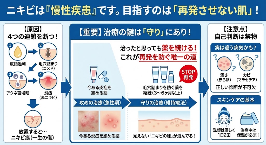 今回は非常に多くの患者さんが悩まれている「ニキビ(尋常性ざ瘡:じんじょうせいざそう)」についてお話しします。 「青春のシンボルだから放っておけば治る」「市販薬を塗っているけど、繰り返す」 もしそう思われているなら、その認識は少し古いかもし... -