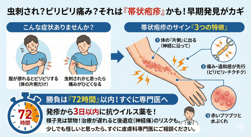 帯状疱疹の特効薬(抗ウイルス薬)は、発疹が出てから3日(72時間)以内に飲み始めないと効果が薄れてしまいます。「帯状疱疹かな?」と思ったら、すぐに皮膚科専門医の診察が必要です。