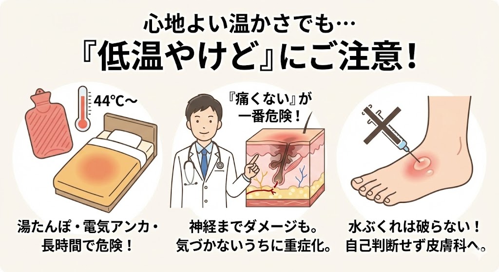 「熱い!」と感じて飛び起きる普通のやけどと違い、寝ている間に痛みなく進行するため、気づいた時には重症化していることが多いのです。