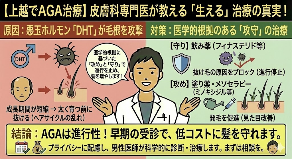 上越市でも多くの方が悩まれているAGA(男性型脱毛症)。市販の育毛剤を試しても効果がなく、諦めていませんか?
