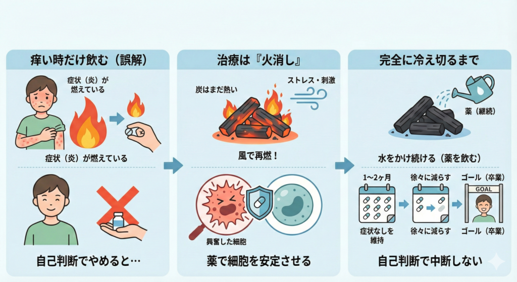- 薬で症状が消えた状態=「炎は消えたが、炭はまだ熱い」